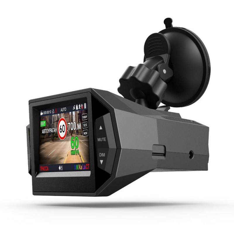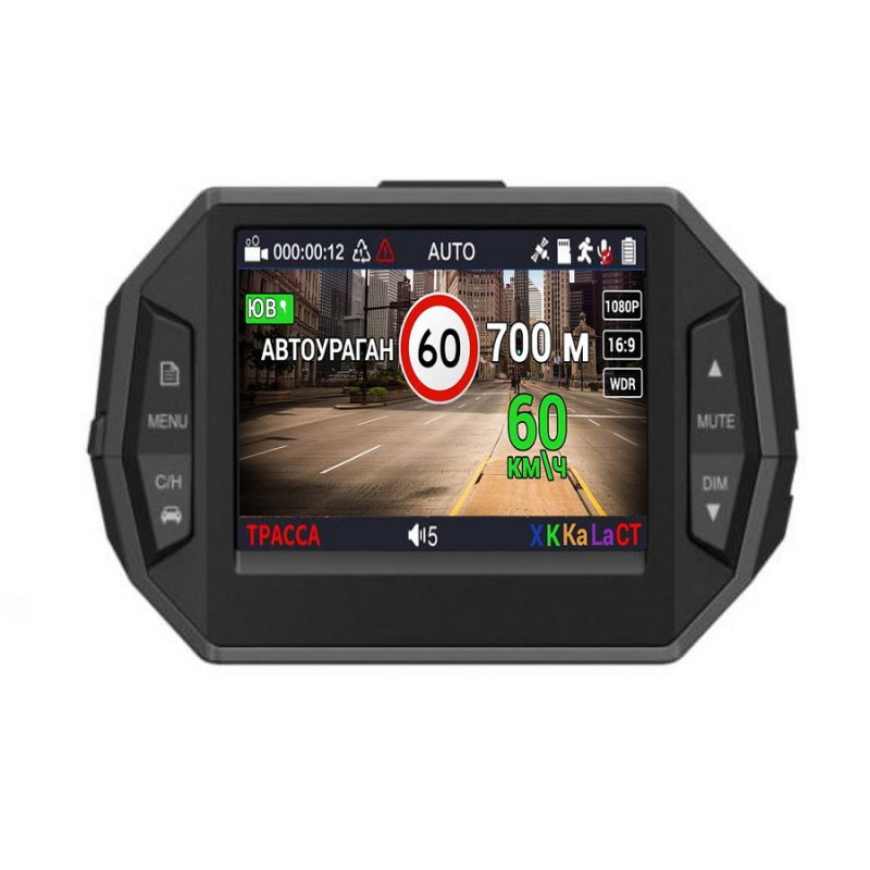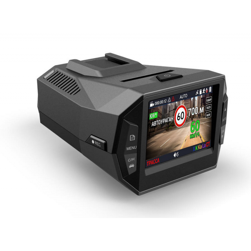 Любые предупреждения о камерах и изображение с камеры видеорегистратора выводятся на один общий дисплей 2,4 дюйма. Визуальные оповещения дублируются голосовыми подсказками на русском языке. На дисплее отображаются оповещения и подсказки о актуальной скорости, о разрешенной скорости, о названии полицейского радара и пр.